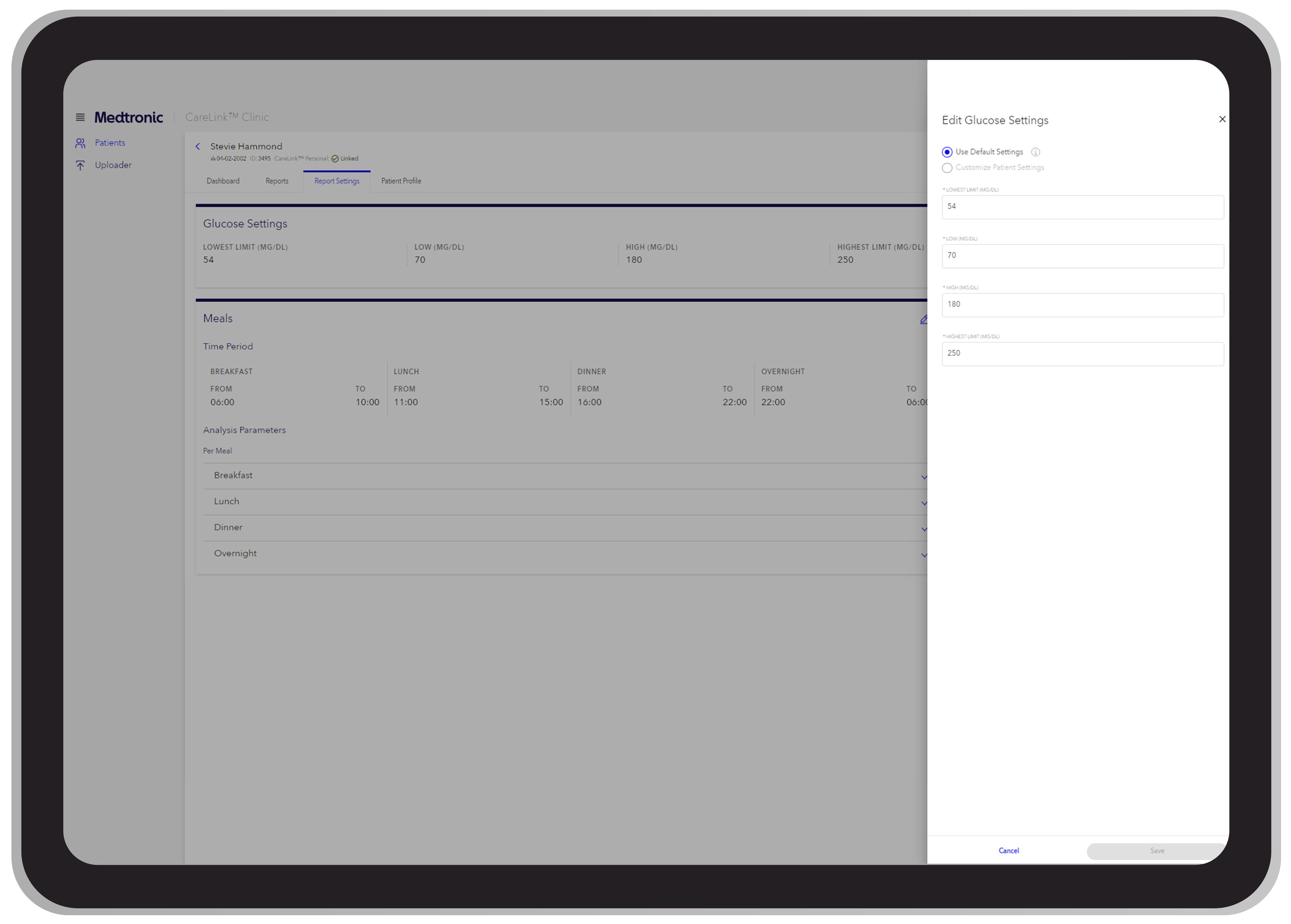 - Set customized glucose targets per patient in their report settings