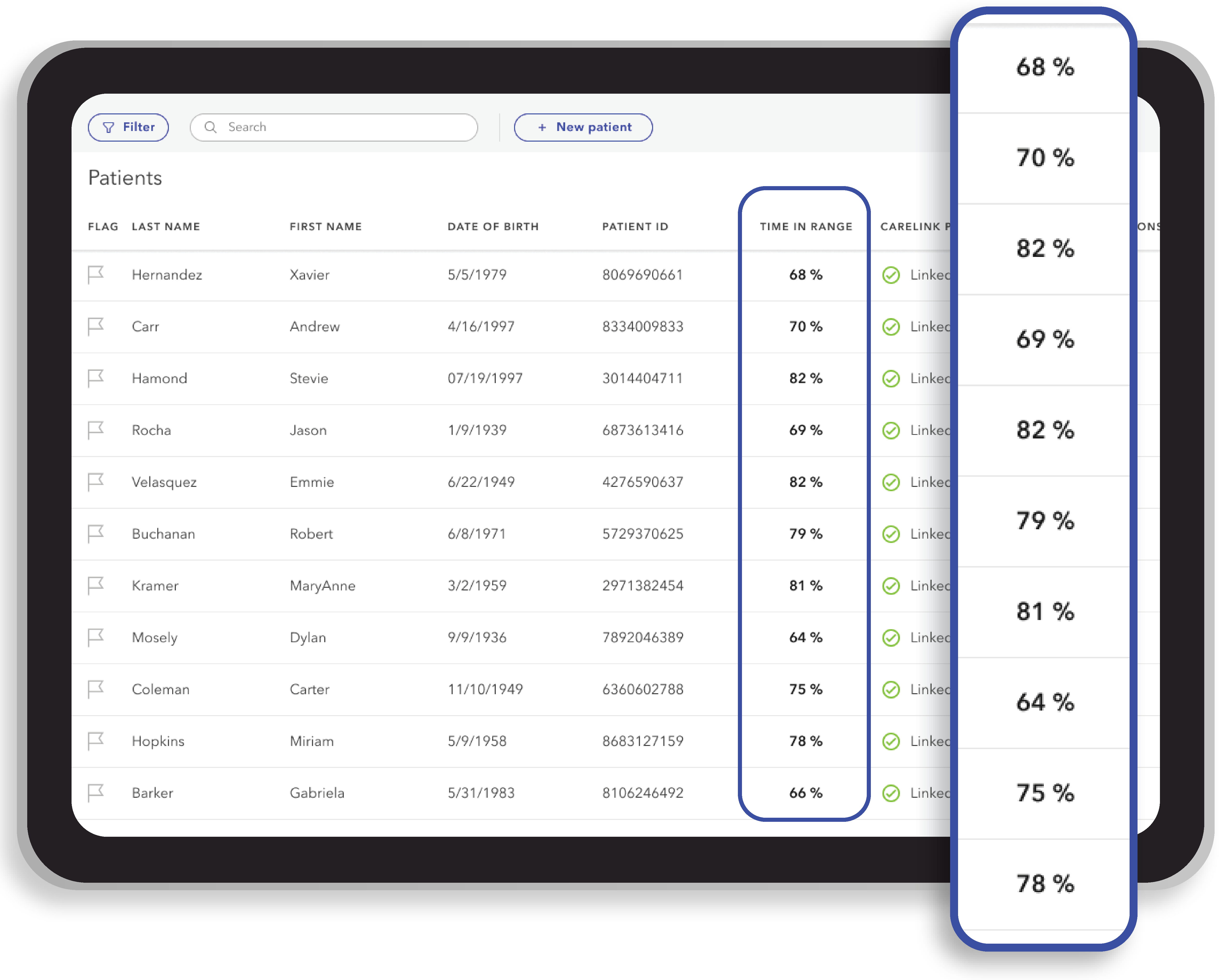 A dedicated Time in Range (TIR) column within the patient list helps quickly identify the performance of your patients’ therapy